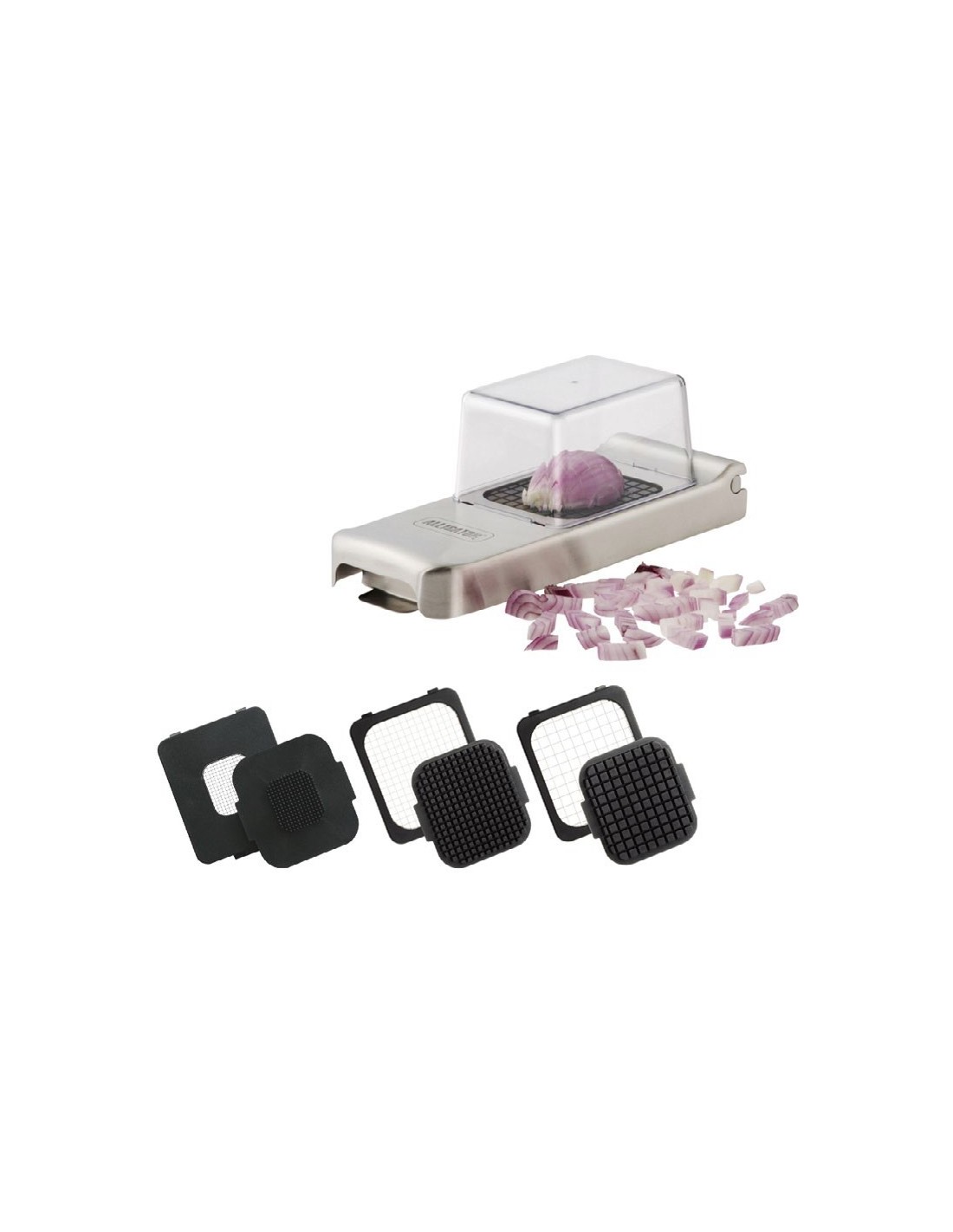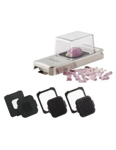 KIT MULTICORTE CON 3 CORTADORES: PARA CORTAR PATATAS (12X12MM), PICAR CEBOLLAS (6X6MM) Y PICAR AJOS (3X3MM). MEDIDAS: 28X11X10CM. 0,985Kg.