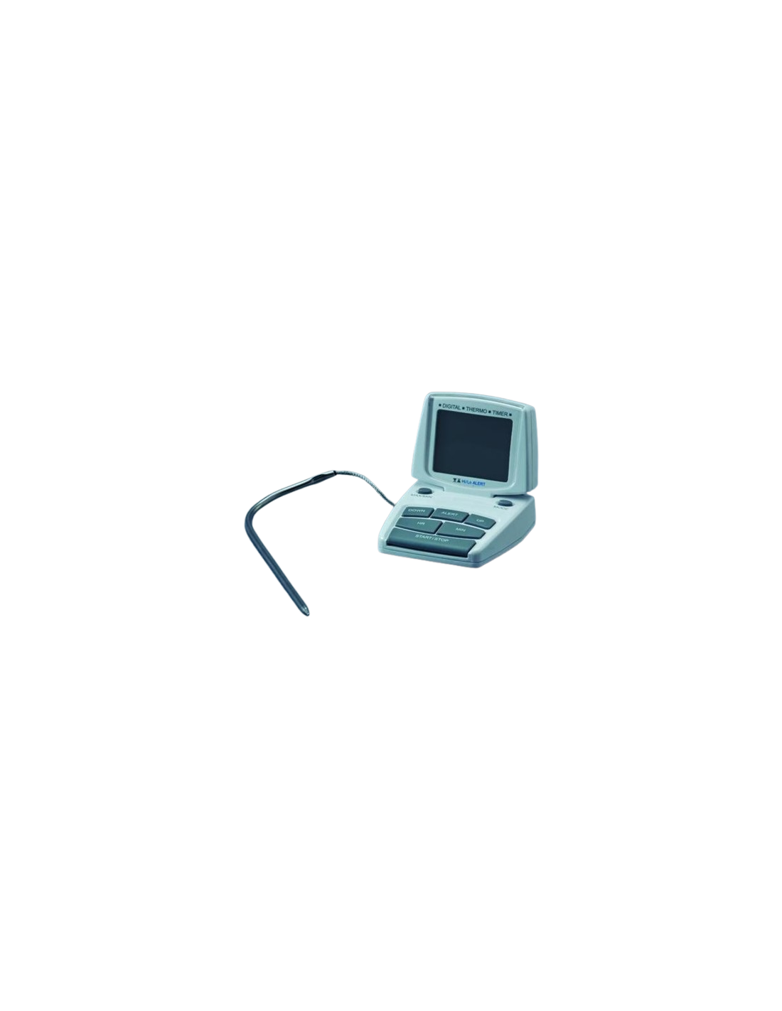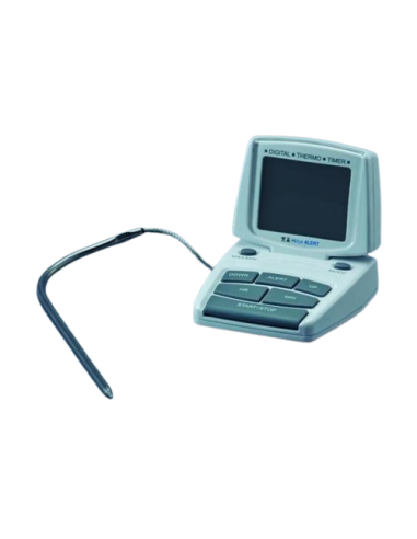TERMOMETRO, RELOJ Y AVISADOR. IDEAL PARA MEDIR LA TEMPERATURA DURANTE EL PROCESO DE COCINADOS, Y PARA LA MEDIDION DEL JARABE-AZUCAR, YA QUE DISPONE DE UN CABLE METÁLIC0 DE 1 M DE LARGA QUE LO PROTEGE DE LAS TEMPERAT., A DIFERENCIA DE LOS DE PLASTICO. RANGO DE -10/+200 GRADOS C., ALARMA PROGRAMABLE, TEMPERATURA MAXIMA Y MINIMA, RELOJ, AVISADOR Y CRONOMETRO. CON IMAN PARA FIJAR.