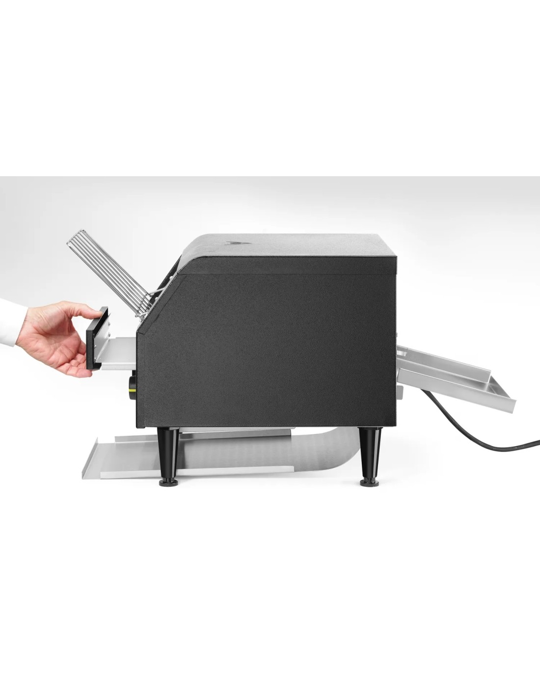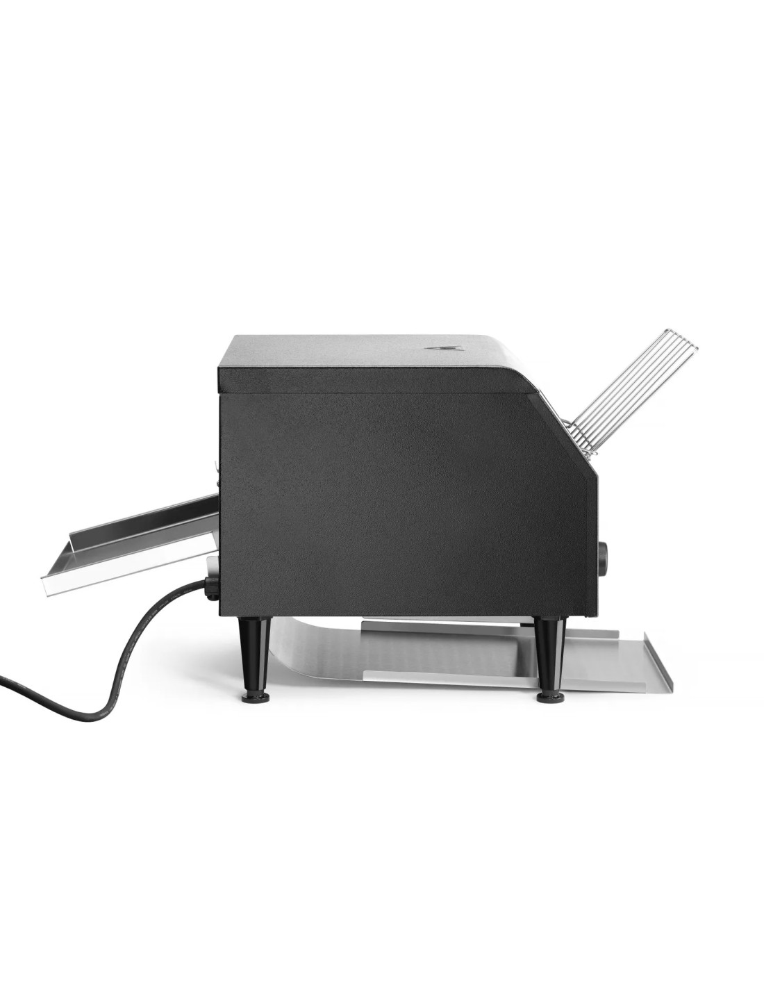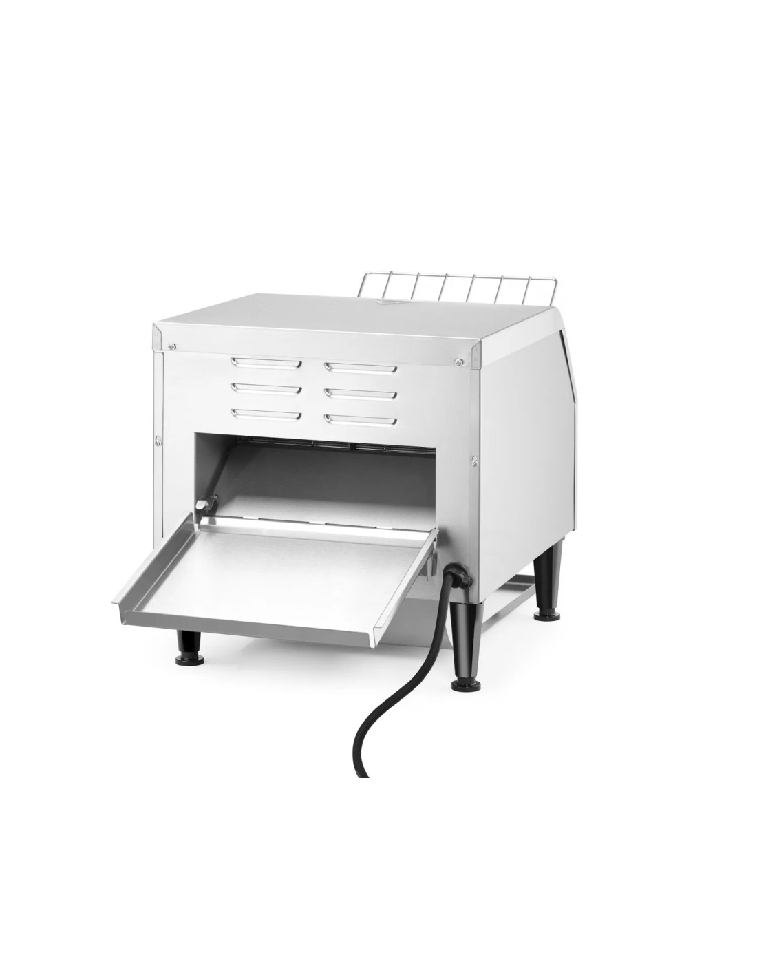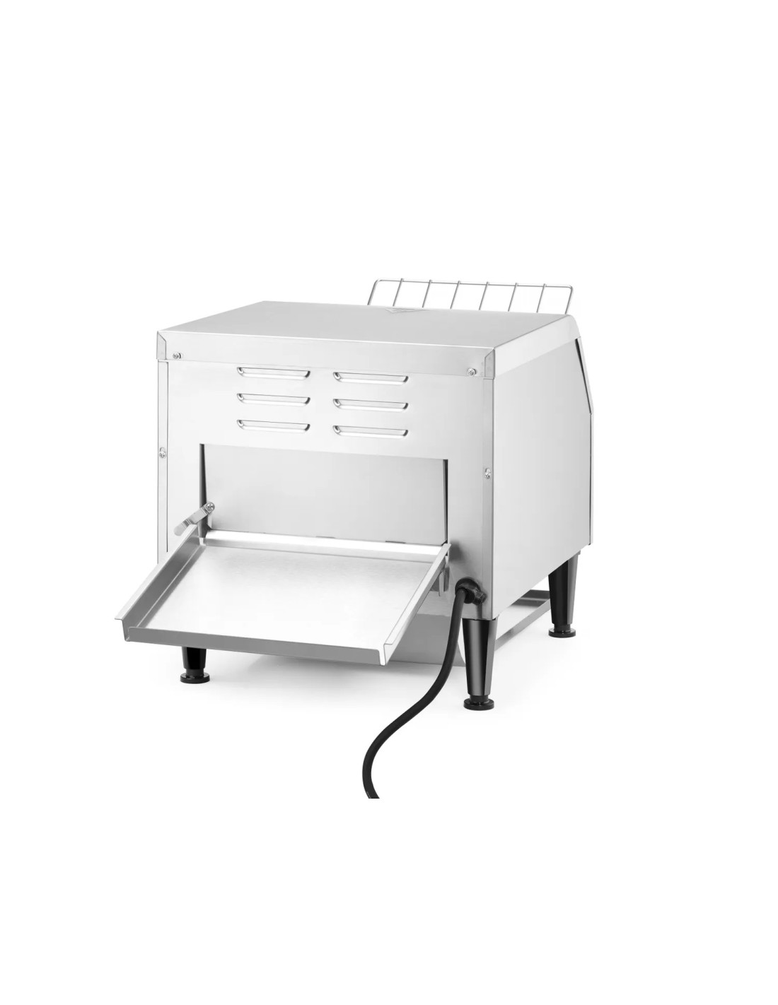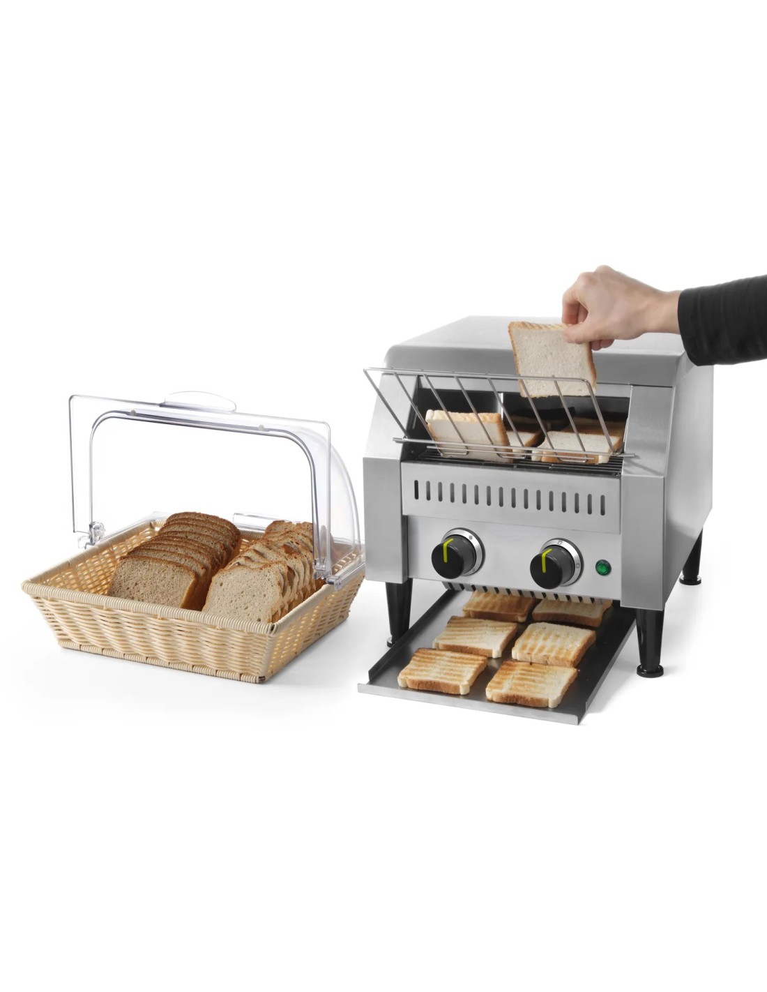 El tostador tiene cabida para dos filas de rebanadas de pan, una junto a otra. Dos elementos de calentamiento separados. Apto para tostar rebanadas de pan de manera continuada. Incluye bandejas frontal y posterior. Tiempo de tueste ajustable hasta 3 minutos.